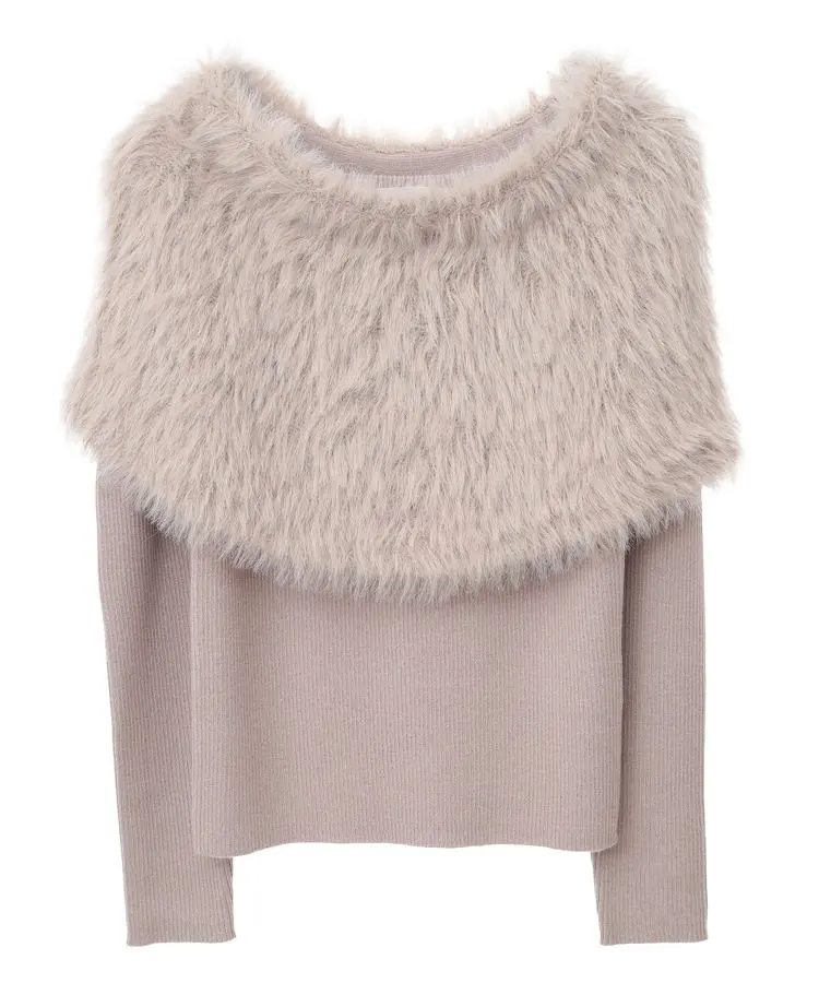 ふわふわのフェイクファー素材のケープとリブニットを組み合わせたセットアイテム。スクエアネックのニットはソフトフィットなコンパクトシルエットがフェミニンな印象です。アンサンブル使いはもちろん、それぞれ単品使い出来るのも魅力的。暖かみのあるファー素材が着映えを叶え、シーズンムードを高めてくれます。