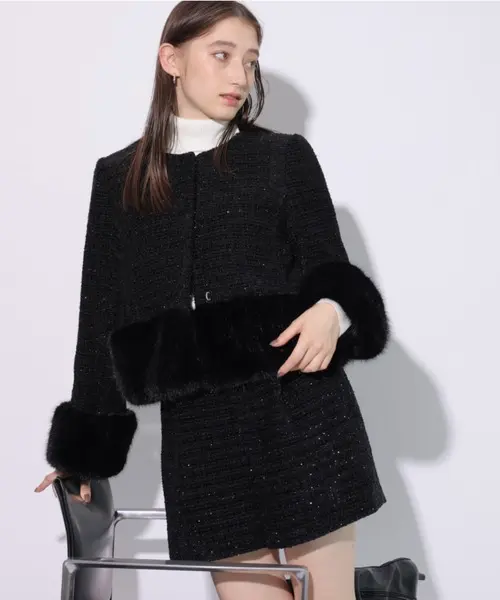 袖口と裾にあしらわれたファーが可愛らしいアクセントになるコート。ツイード調の生地で上品な風合いを演出してくれます。ノーカラーのデザインなので、ハイネックのトップスと合わせたスタイリングがおすすめ◎季節の変わり目のお出かけシーンに重宝したいアイテムです。引用元:Rirandture(リランドチュール)の「ツイードファーコート(ダウンジャケット/コート)」 – WEAR