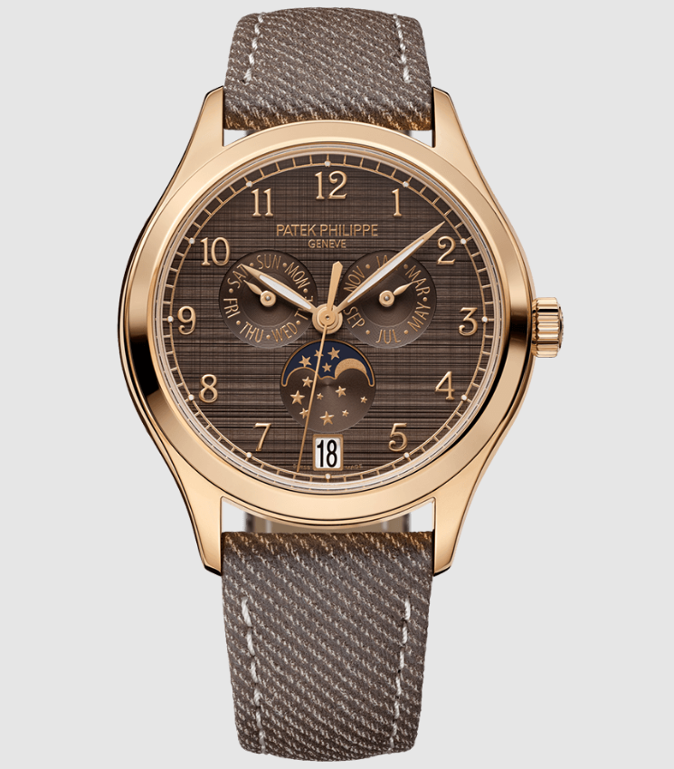 ローズゴールドの温かみのある輝きが、山東の絹織物を連想させる縦横サテン仕上げを施したチェストナット文字盤とエレガントに組み合わされています。