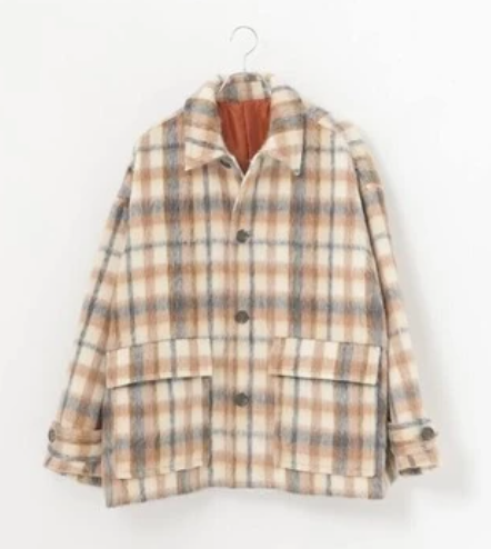 レディース素材ですがシックな色使いに面積の小さいショートコートに落とし込むことでメンズでも着こなしやすいアイテムです。