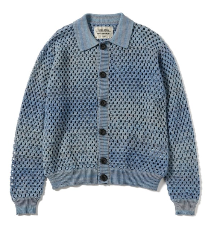 ブルーのグラデーションが可愛らしい襟付きカーディガン。手編みの風合いが可愛らしく、さっと羽織るだけでもコーディネートが格上げされます。