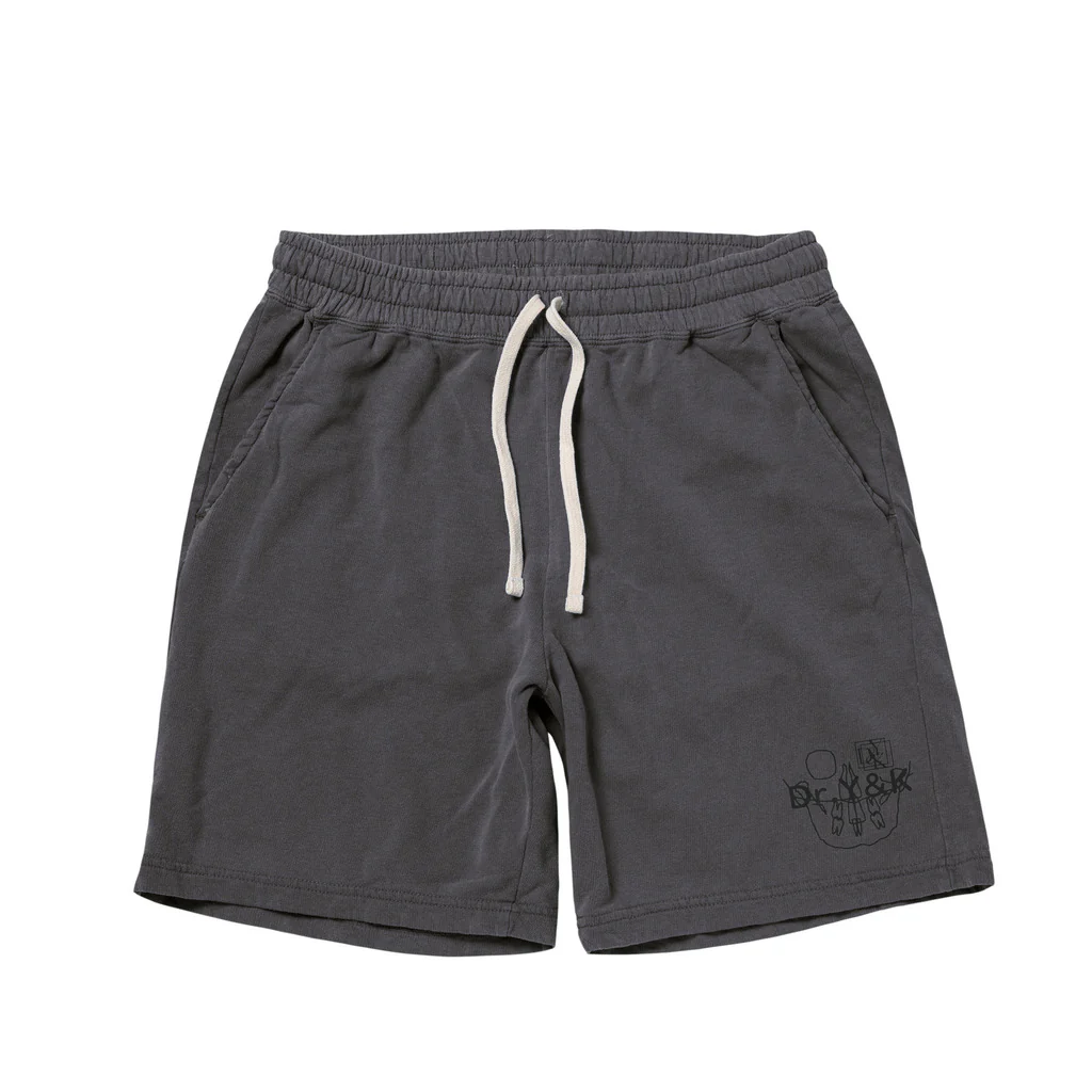 レントゲンモチーフのグラフィックが特徴的なショートパンツです。 深みのあるダークグレーの本体に、骨や関節のようなラインがあしらわれたアートワークが右足に配置されており、控えめながらも確かな個性を放ちます。まるで人体の内面をさりげなく覗き見るような、ユーモアとスタイリッシュさが融合したデザインに仕上がっています。 ややゆったりめのシルエットと柔らかい素材感は、デイリーでもリラックスして着用できる快適さを提供。白いドローストリングがアクセントとなり、アーバンでスポーティな印象も加味しています。