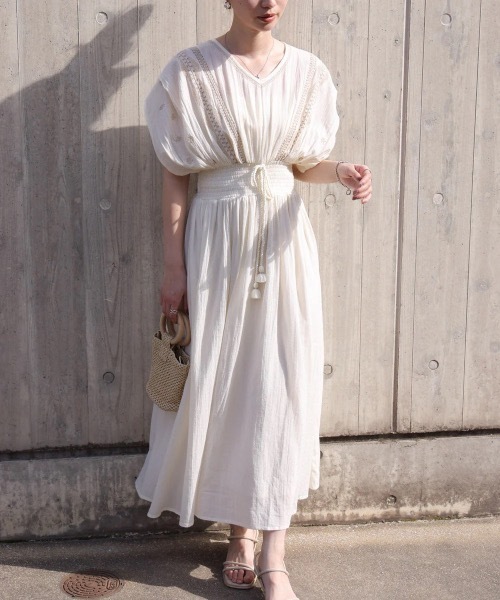 昨シーズンも大好評だったインドコットンを贅沢に使用したワンピース!柔らかくさらっとした質感で肌触りがよく、軽いシワ感はオリエンタルな情緒が漂います。ほどよくシアー感があり、ロングワンピースながら抜け感を演出できる1枚。顔周りやデコルテをすっきりと見せるVネックとウエストシャーリングでスタイルアップも叶い、脚長効果も期待できます。派手過ぎず上品見えする刺繍の位置やデザインにもこだわりました。