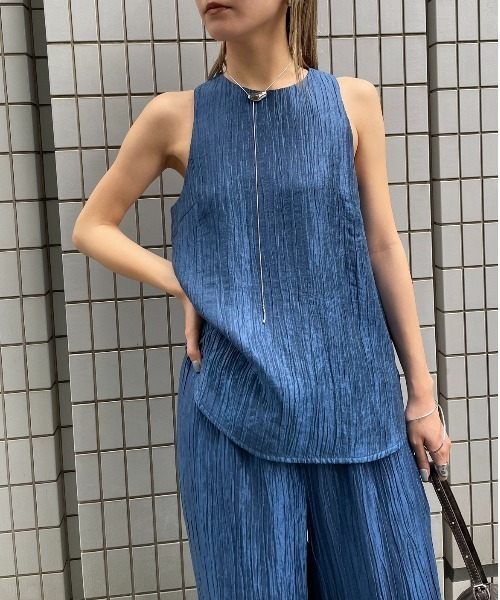 サイドのタックや、バックネックのギャザーで立体的なフォルムも目を惹くポイント。