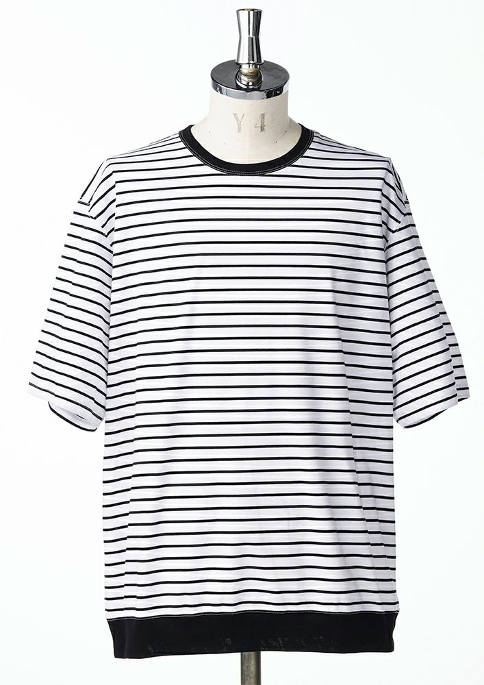 AKM定番の半袖クルーネックTシャツをベースに、袖は五分丈、サイズ感をビッグシルエットにアレンジしています。衿、裾はリブ(フライス)仕様です。