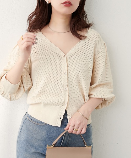 繊細な細かいスカラップのようなデザインとメッシュ編みがポイントのカーディガン。