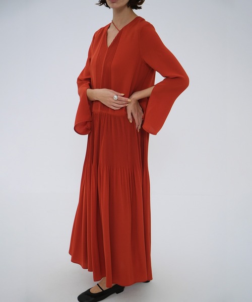 身頃にはピンタック、スカート部分には消しプリーツを施し、無地の生地に表情を与え、映えるアイテムに仕上げました。あえてウエストラインを落としルーズな印象にしているため、体型を拾わず幅広いお客様にご着用いただけます。