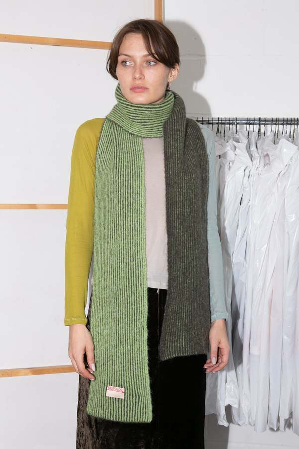 グリーンとグレーのツートンカラーのリブ編みマフラー。Paloma Woolのブランドラベル付き。長さ:212cm、幅:20cm。素材:レスポンシブルアルパカ12%、ミュールジングフリーメリノウール14%、ミュールジングフリーウール15%、アクリル28%、ポリアミド29%、エラスタン2%。レスポンシブルアルパカは、自然環境で飼育され、その習性を尊重したアルパカから作られています。アルパカのBBYラベルは、生後3年未満で初めて毛を刈り取った動物のウールであることを意味します。スペイン製