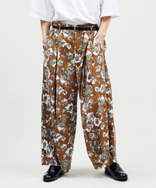 勝利が着用していたのは、Air Tokyoの麻混 フラワープリント イージー タック バギーパンツ! 落ち着いたブラウンやネイビーを基調とした中に、花柄のプリントが施されており、大人っぽさと遊び心を両立させています。