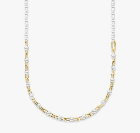 イエローゴールドの輪とパールでチェーンを表現した「ファイン リンク」。パールとチェーンのモチーフを合わせたロングネックレスは、二連にしたり、アシンメトリーに纏ったりと、着け方のアレンジをお楽しみいただけます。同シリーズのチョーカータイプのネックレスとセットでコーディネートいただくのもおすすめです。