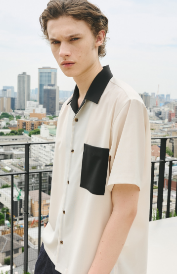 白と黒のバイカラーが効いたこのシャツは、襟と胸ポケットを黒で切り替えたデザインが特徴的で、モノトーンながらも強い存在感があります。オープンカラーの抜け感がありながら、ウール混の上質な素材感で上品さを保っているのがポイント。