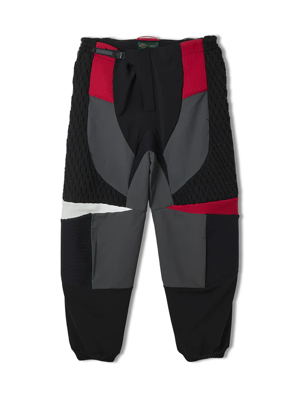 モトクロスパンツの本格的なデザインをベースに、ニットと布帛をドッキングさせたこだわりの一着。パンツ全体を一度布帛生地で作り上げ、その上にオリジナルのニット編み地をパーツごとに組み合わせることで、他にはない特別なテクスチャーとデザインを実現した。組織にはケーブル編み、リブ編み、ジャガード編みを巧みに取り入れ、部分ごとに変化をつけた表情豊かな仕上がりに。ニットと布帛の異素材の組み合わせが、視覚的にも触覚的にも楽しめるパンツとなっています。ウエストには、本物のモトクロスパンツに使用されるアジャスターを採用し、スポーティなディテールをプラス。また、ヒップ部分には両サイドにコンシールファスナーポケットを配置し、デザイン性と実用性を両立させている。