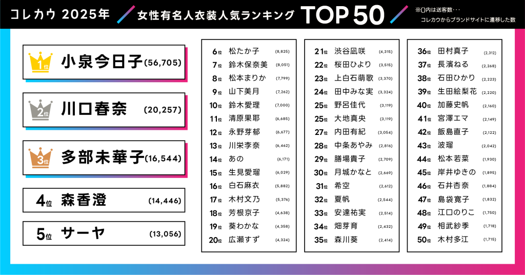 「コレカウ」ではドラマ・バラエティ・ニュース・SNSなど、さまざまなメディアで有名人が着用した衣装情報をもとに、2025年にファッション面で注目を集めた女性有名人ランキングTOP50を発表!早速チェックしていきましょう!